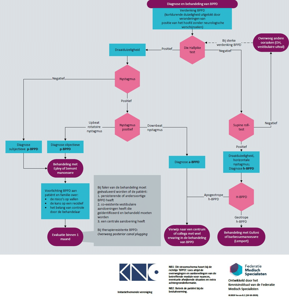 Om BPPD te diagnosticeren en onderscheid te maken in BPPD-variant, dient gestart te worden met de Dix-Hallpike (opent in nieuw tabblad) test. Is deze positief, en wordt hierbij draaiduizeligheid met nystagmus opgewerkt, kan de diagnose BPPD van het onderste kanaal (p-BPPD) gesteld worden.